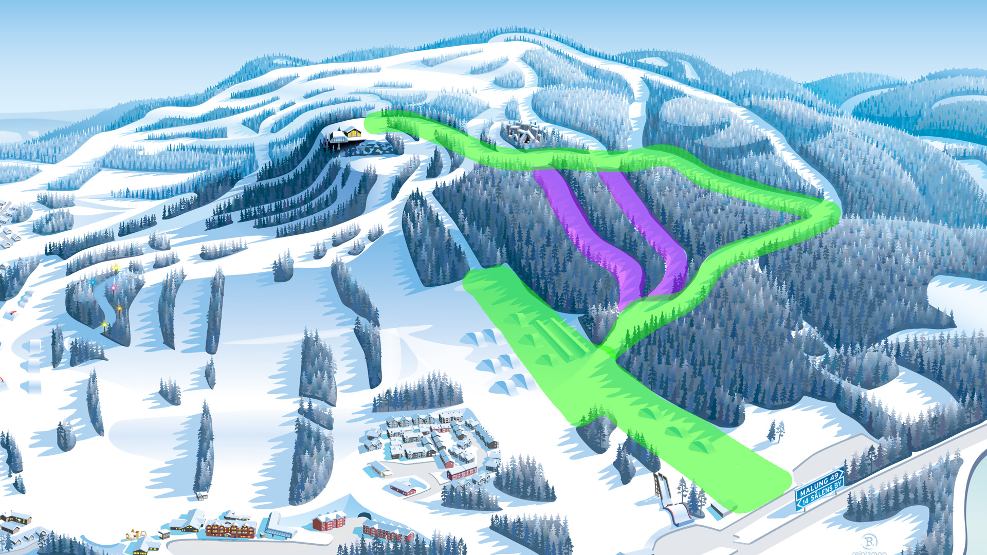 Här ser du en översikt över vilka pister som är öppna. Den grönmarkerade sträckan visar åkytan som är förberedd för features och hopp. De lila linjerna markerar svarta backar som är öppna för åkning