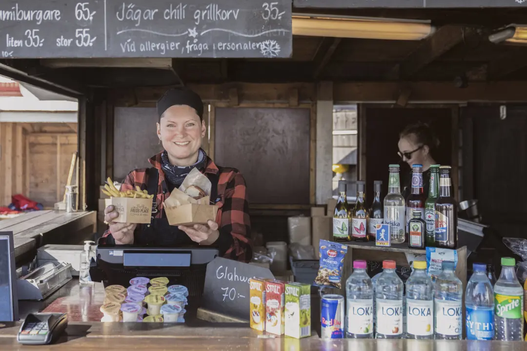 Located right in the square, you'll find Kläppen's popular burger joint. The menu offers juicy burgers, crispy chips, warm toasts and other favourites that the whole family loves. Order what tempts you most and settle down on soft reindeer hides in front of the crackling fire.