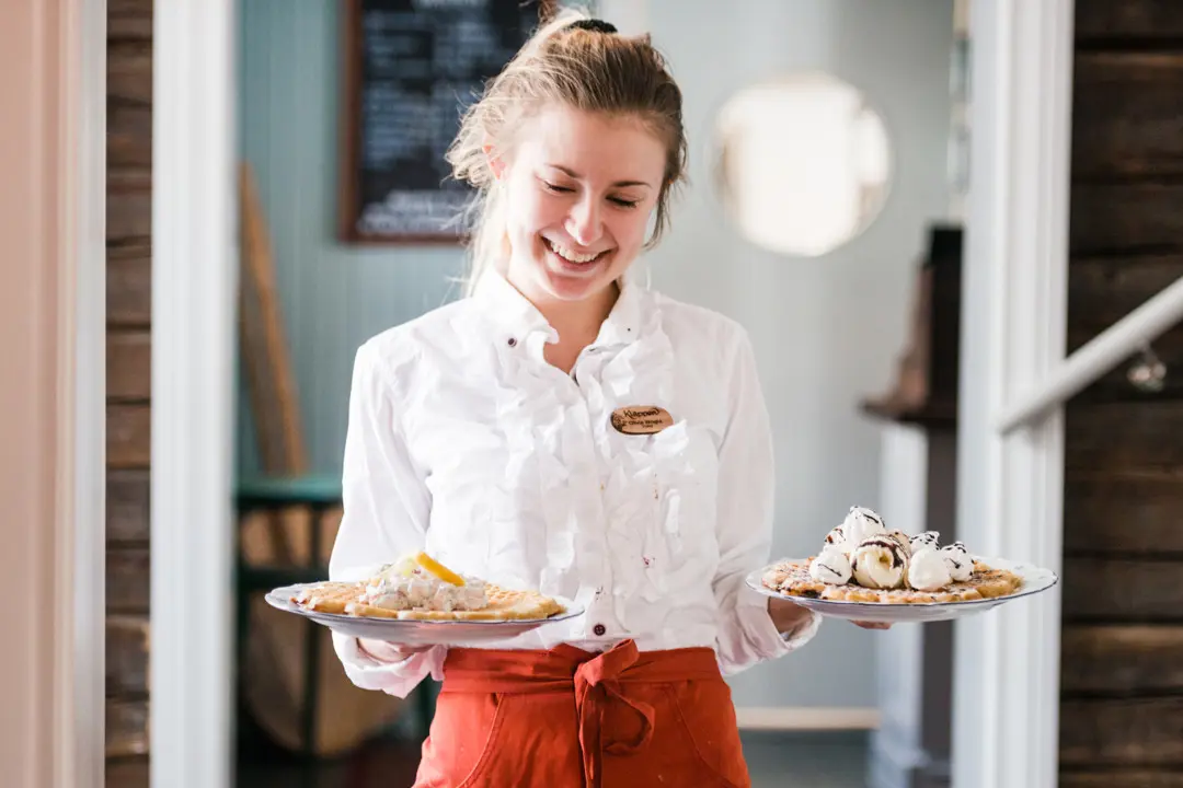 In the kitchen, our renowned crispy and golden waffles are cooked, topped with cloudberry jam, cream, or ice cream. For those looking for something more substantial, we offer our popular waffle with Skagen mix, or perhaps a steaming goulash soup and a freshly baked lunch baguette from Bageriet? If you have any allergies, just let us know. We offer gluten-, egg-, and dairy-free options, as well as vegan ice cream.